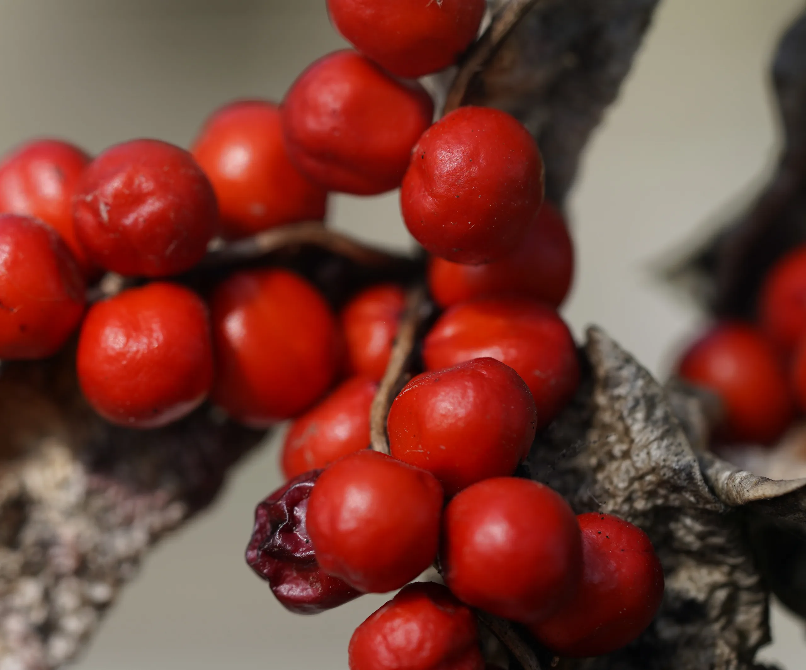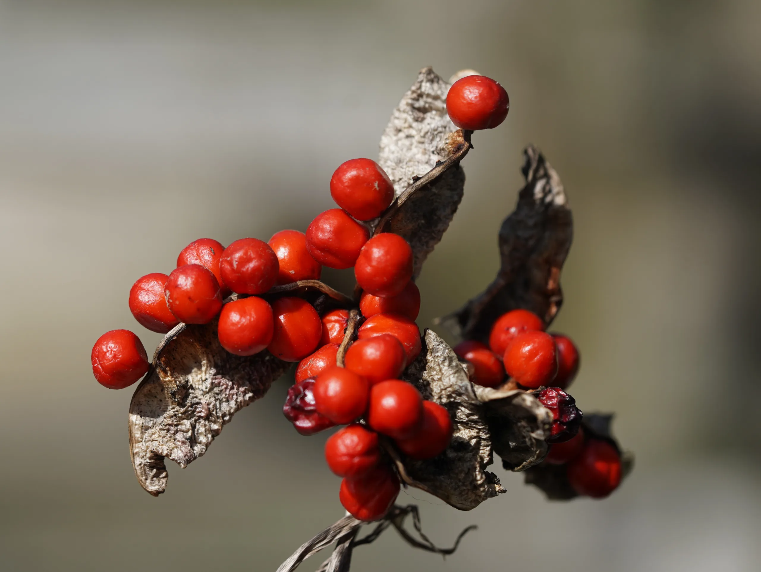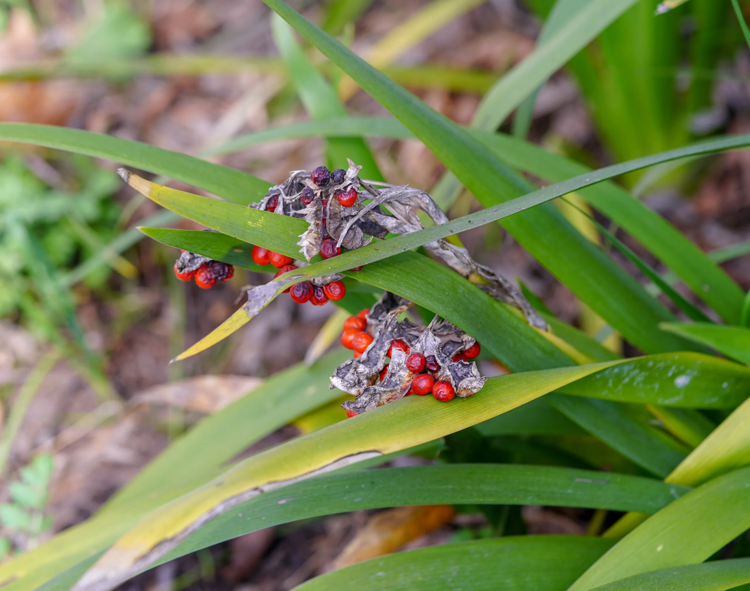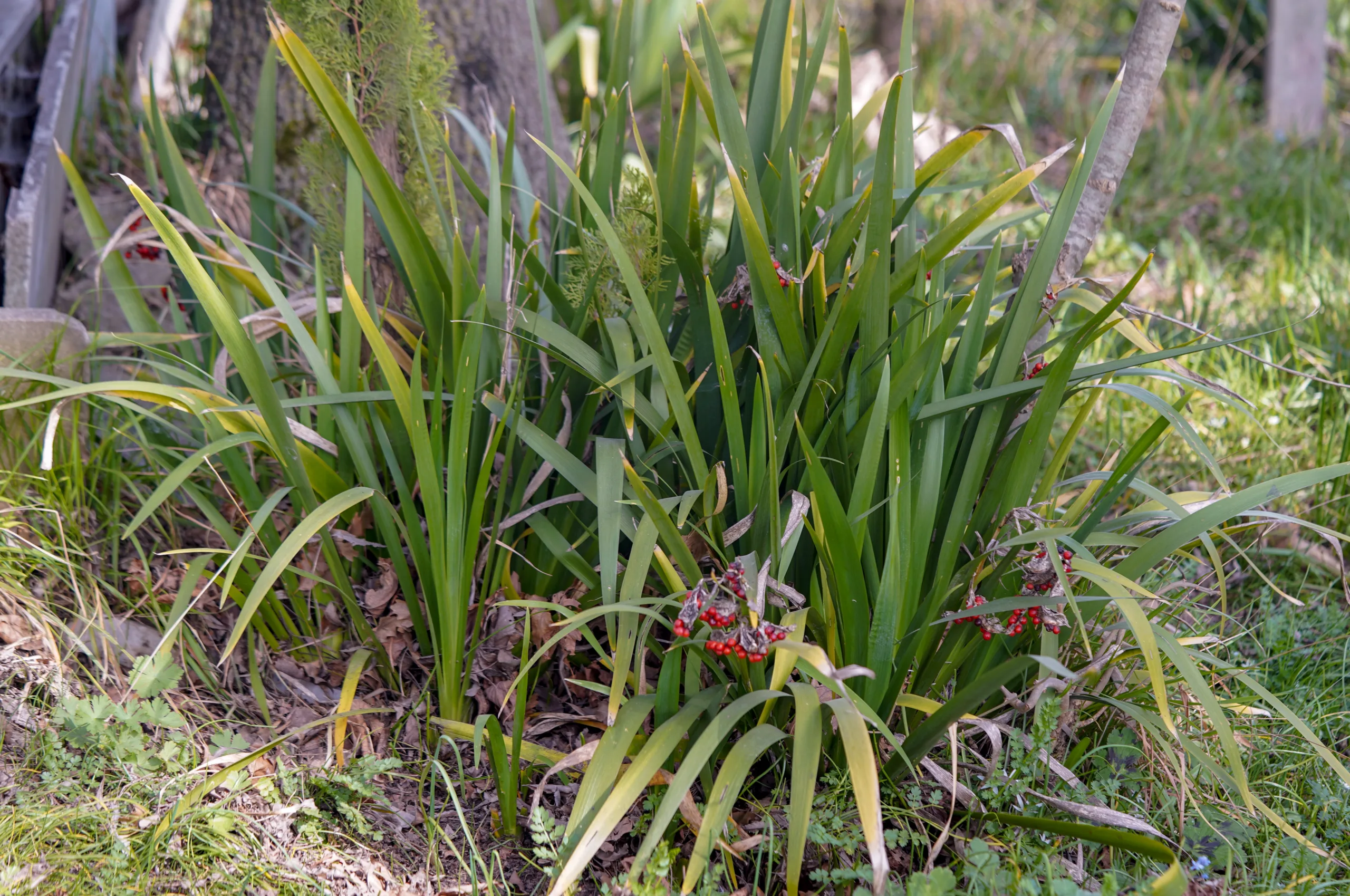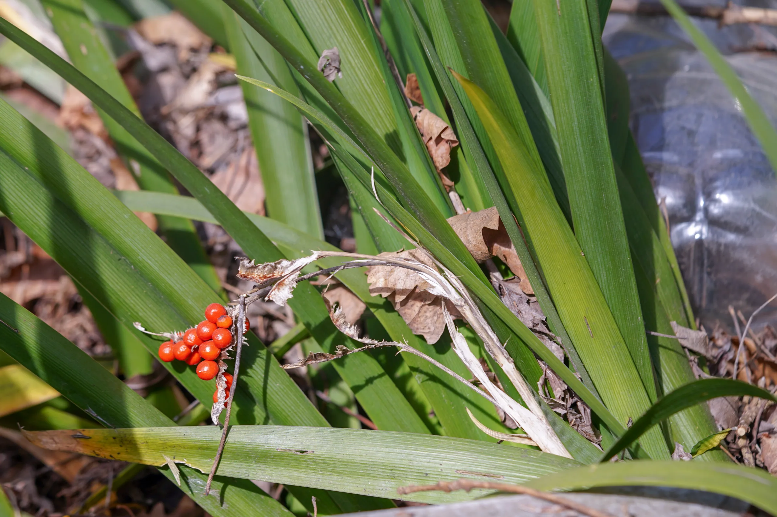 Iris foetidissima, kış boyunca duran parlak kırmızı tohumları ve kötü kokulu yaprakları ile karakteristik olan popüler bir süs bitkisidir.